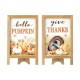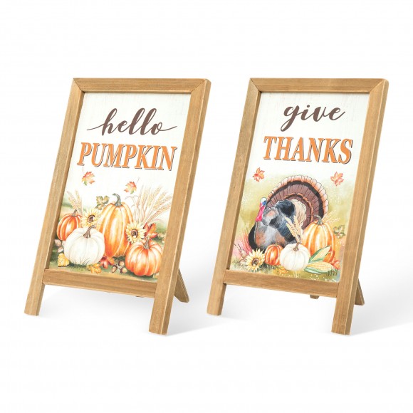This set of 2 mini table easel decoration adds a touch of autumn class to any table top, windowsill, shelf, or kitchen counter. One is suitable for Harvest says “hello pumpkin”, the other is for Thanksgiving says “ give thanks”. The wooden frame design has a rustic feel and can fold easily for quick convenient storage.